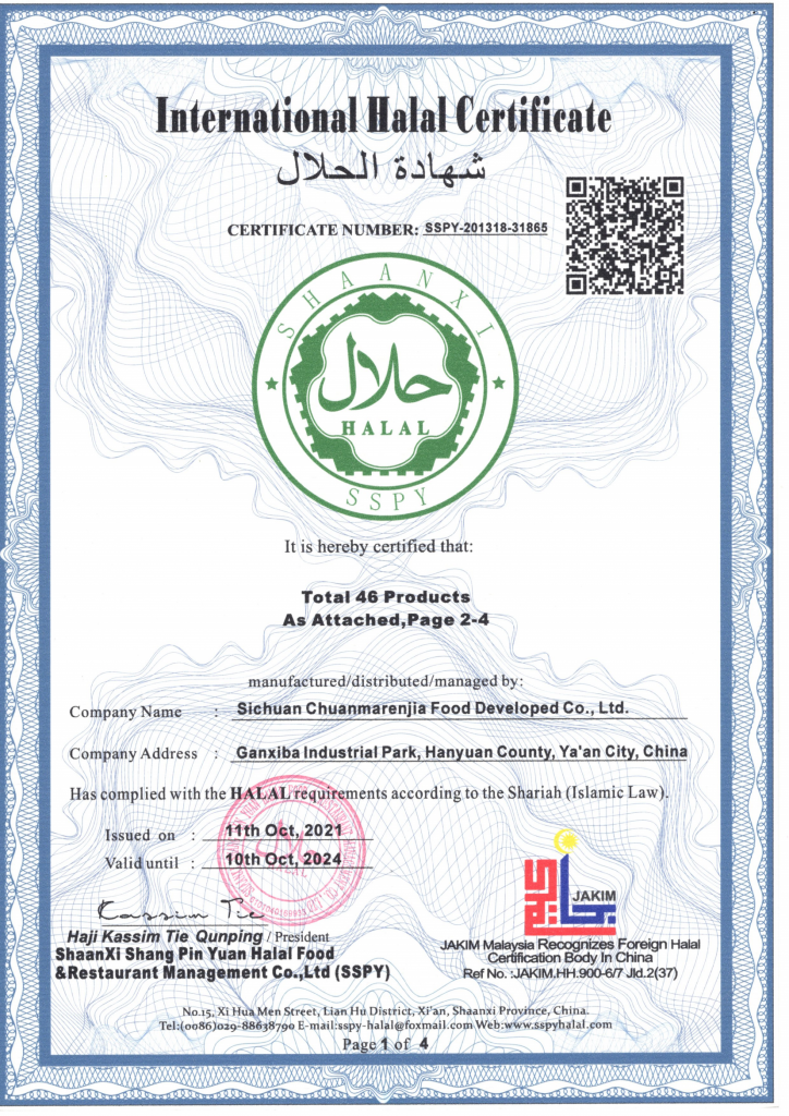 ? ? ? ?清真認(rèn)證,即符合穆斯林生活習(xí)慣和需求的食品、藥品、化妝品以及食品、藥品、化妝品添加劑。為響應(yīng)國家“一帶一路”倡議,滿足沿線國家對清真產(chǎn)品不斷擴(kuò)大的市場需求,川麻人家抓住機(jī)遇,依托母公司丁點(diǎn)兒股份專注川菜標(biāo)準(zhǔn)化調(diào)味品22年的生產(chǎn)技術(shù)及產(chǎn)品研發(fā)優(yōu)勢,專注于漢源花椒及清真復(fù)合調(diào)味品研發(fā)、生產(chǎn)、加工,致力于清真美食的創(chuàng)新與推廣,促進(jìn)國際清真飲食文化交流和發(fā)展。