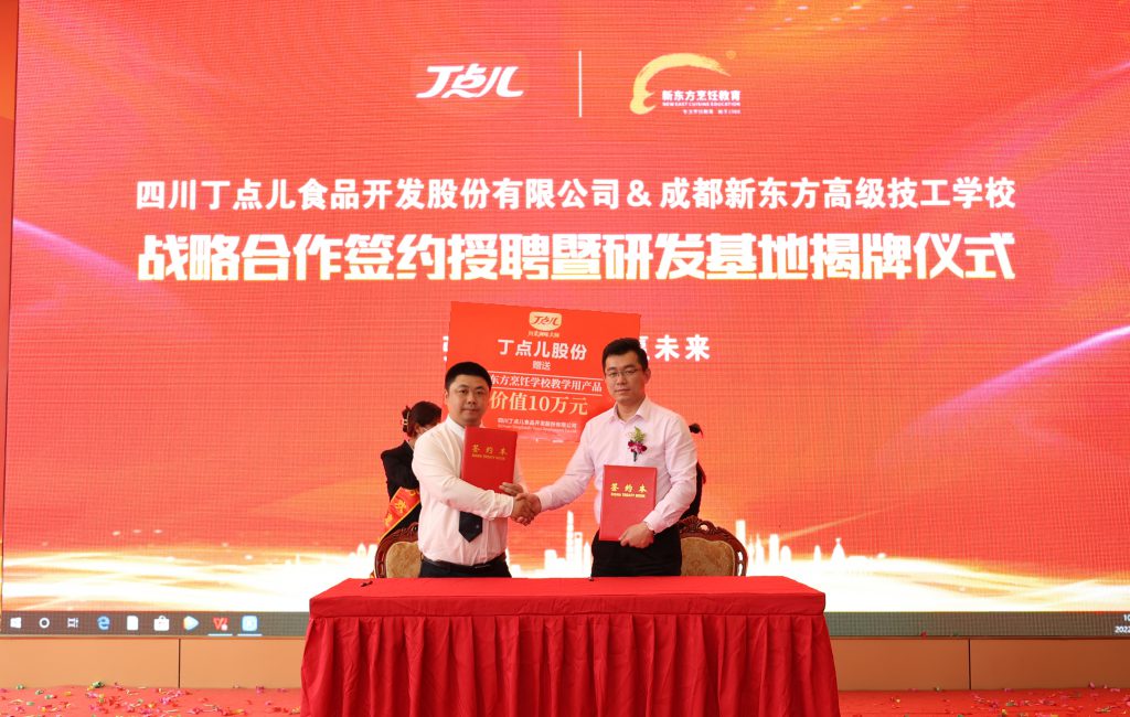? ? ? ? 為進一步深化產教融合,加強校企合作,推動人才培養(yǎng)模式變革,4月27日上午,四川丁點兒食品開發(fā)股份有限公司與成都新東方高級技工學校戰(zhàn)略合作簽約暨授聘儀式、研發(fā)基地揭牌儀式在成都新東方烹飪學校隆重舉行。