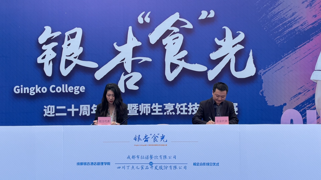? ? ? ?隨后,成都銀杏酒店管理學院酒店管理系執(zhí)行系主任徐君宜、丁點兒股份技術中心產品應用培訓部副部長陳證宇代表雙方簽署戰(zhàn)略合作協(xié)議。徐主任代表學校向丁點兒股份授予了“校企合作”牌匾。至此,雙方正式達成校企合作共識。希冀通過雙方的共同努力,將丁點兒股份的品牌文化及產品風味根植在餐飲烹飪學子的心中,同時促進成都銀杏酒店管理學院烹飪學院優(yōu)秀畢業(yè)生將富含丁點兒風味的美食作品更多的呈現(xiàn)在消費者的餐桌之上。