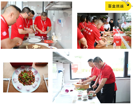 現(xiàn)場(chǎng),大廚們還以分組抽盲盒食材的形式,現(xiàn)場(chǎng)進(jìn)行菜品制作挑戰(zhàn)。大廚們摩拳擦掌、分工有序,用丁點(diǎn)兒干鍋醬、藤椒油、金湯酸菜醬、椒麻雞汁等產(chǎn)品快速出品了一道道色香味俱全的美味佳肴。