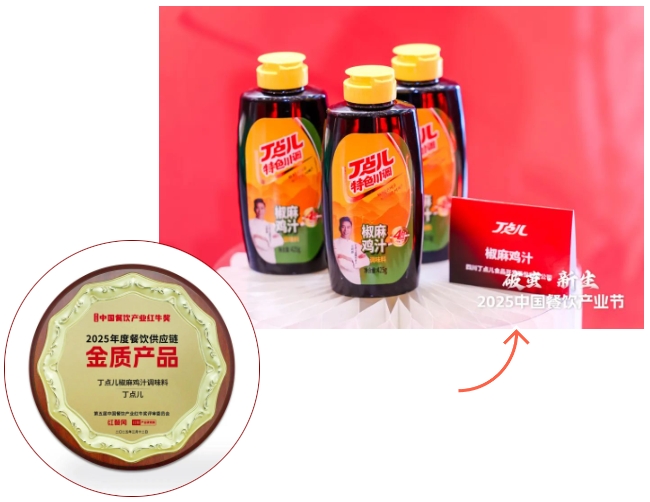 在風向標產(chǎn)品(春季)全球發(fā)布會環(huán)節(jié),丁點兒椒麻雞汁隆重亮相,成為全場焦點,并以出色味型、獨特風味贏得組委會和市場認可,斬獲“2025年度餐飲供應鏈金質(zhì)產(chǎn)品”榮譽稱號。