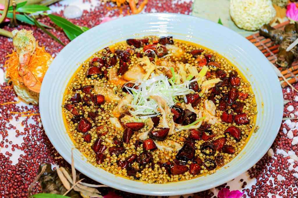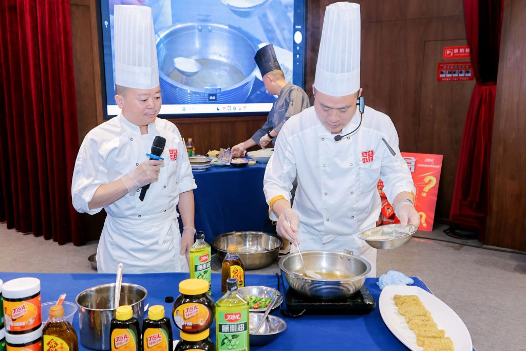 現(xiàn)場,行政總廚李偉、王俊成現(xiàn)場演繹經(jīng)典川菜創(chuàng)新烹飪技法。用丁點(diǎn)兒椒麻雞汁、藤椒油、青花椒麻辣醬等高品質(zhì)特色產(chǎn)品創(chuàng)新打造的紅袍尋雙味、清幽九肚魚等特色風(fēng)味菜品,將椒麻味型展現(xiàn)得淋漓盡致,香氣溢滿整個(gè)會場,引得與會嘉賓紛紛前來品鑒交流。