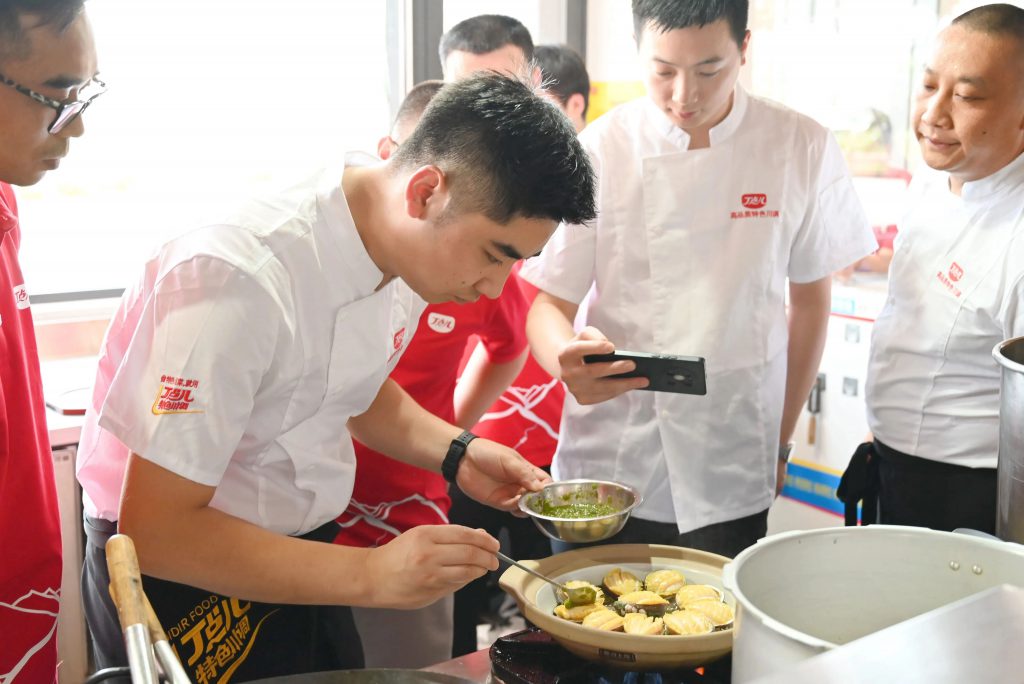 互動(dòng)環(huán)節(jié),嘉賓分組競技,圍繞干鍋、椒麻、泡椒、金湯酸菜等特色風(fēng)味用丁點(diǎn)兒高品質(zhì)特色川調(diào)即興創(chuàng)作菜品。通過與會(huì)嘉賓現(xiàn)場(chǎng)投票評(píng)比,最終,以魷魚、豬肚搭配丁點(diǎn)兒泡椒醬烹飪的《滿腹經(jīng)綸》拔得頭籌,贏得滿堂喝彩。