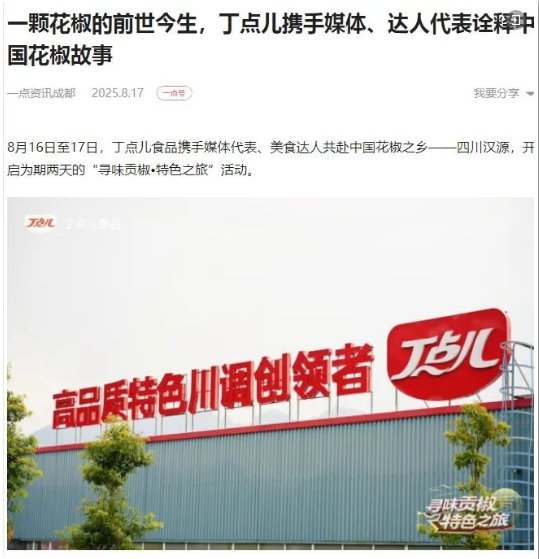 每一篇報(bào)道都是對(duì)品質(zhì)的見(jiàn)證,每一次傳播都是對(duì)匠心的認(rèn)可。在丁點(diǎn)兒2025“尋味貢椒·特色之旅”活動(dòng)期間,來(lái)自全國(guó)的數(shù)十家權(quán)威媒體、行業(yè)平臺(tái)及自媒體博主,以筆為媒,共同記錄了這場(chǎng)關(guān)于風(fēng)味、文化與產(chǎn)業(yè)的深度對(duì)話(huà)。