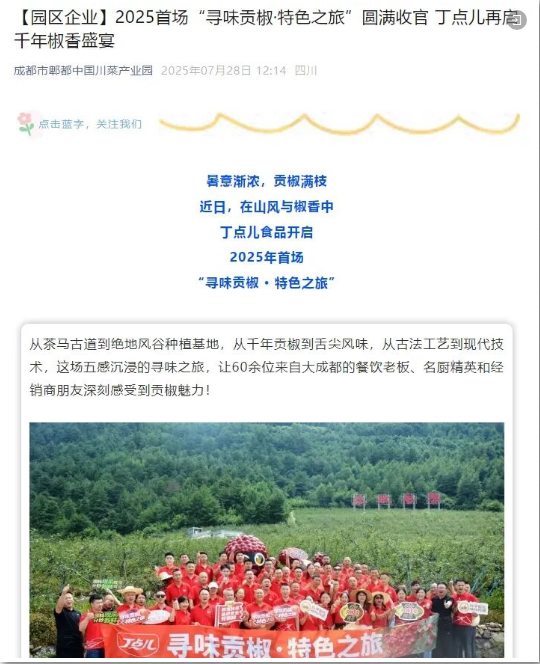 中國(guó)川菜產(chǎn)業(yè)園關(guān)注園區(qū)企業(yè)發(fā)展,詳細(xì)記錄了丁點(diǎn)兒“尋味貢椒·特色之旅”活動(dòng),并將其融入園區(qū)發(fā)展之中;大美漢源則從產(chǎn)地角度出發(fā),講述了漢源貢椒與丁點(diǎn)兒食品攜手共進(jìn)的合作歷程。