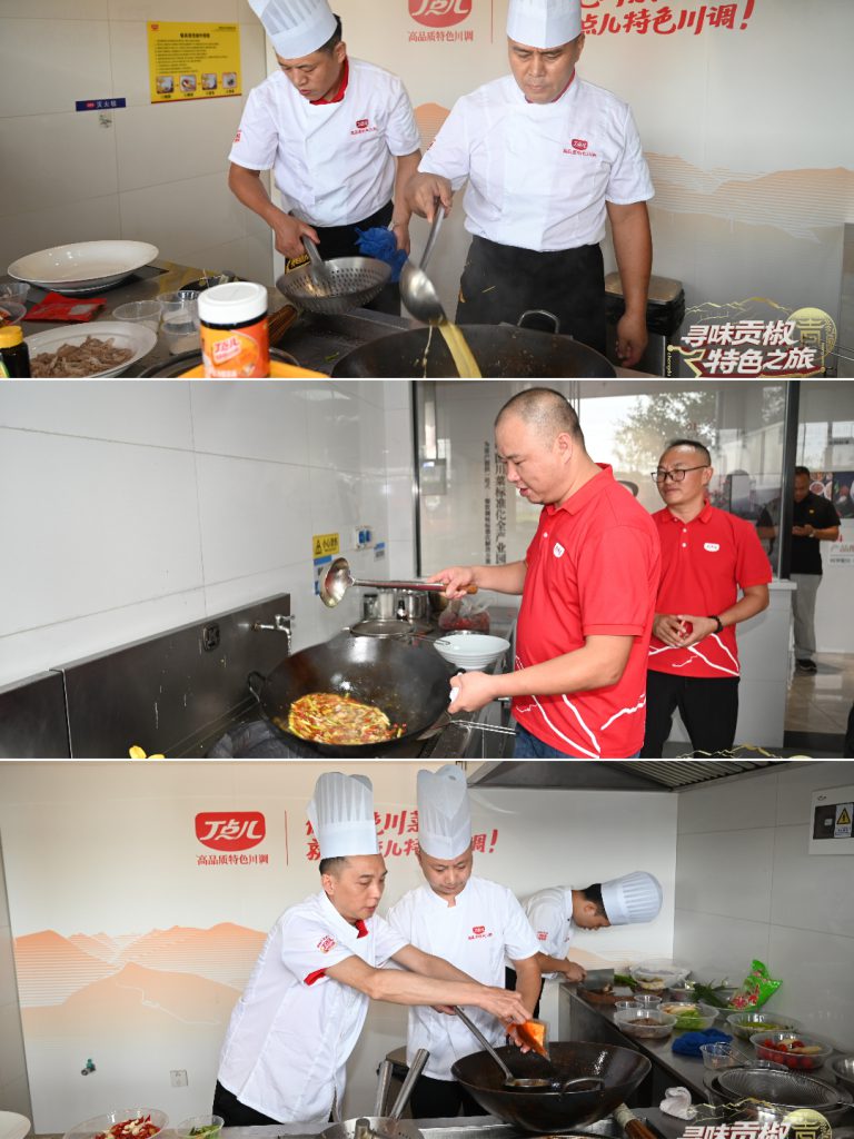 廚藝交流環(huán)節(jié),嘉賓們分組以椒麻、金湯酸菜、泡椒、干鍋四大風(fēng)味為靈感,結(jié)合丁點(diǎn)兒椒麻雞汁、干鍋醬等即興創(chuàng)作佳肴?,F(xiàn)場(chǎng)香氣四溢,創(chuàng)意迭出。