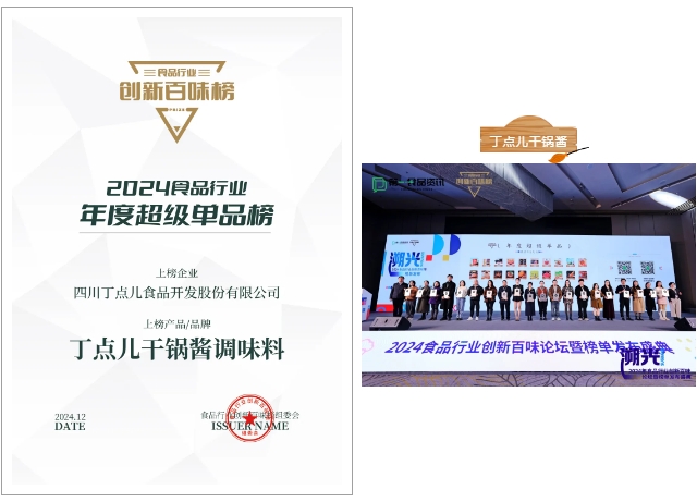 在盛典揭曉的2024食品行業(yè)創(chuàng)新百味榜中,丁點兒干鍋醬以其獨特風味和卓越品質(zhì),在2024年度成為銷量超過1億元的超級大單品,榮登“2024食品行業(yè)年度超級單品”榜。